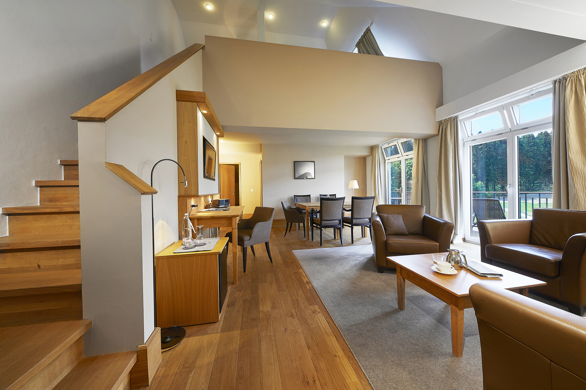Unsere 115m² Panorama Suite mit großem Balkon lädt zum Entspannen mit Blick auf den Rimberg ein. Es ist unsere absolute Premiumkategorie und liegt prädestiniert in der 3. Etage des Hauses und erstreckt sich über 2 Etagen mit separatem Wohn- und Schlafbereich. Das Badezimmer ist ausgestattet mit Badewanne und Dusche.